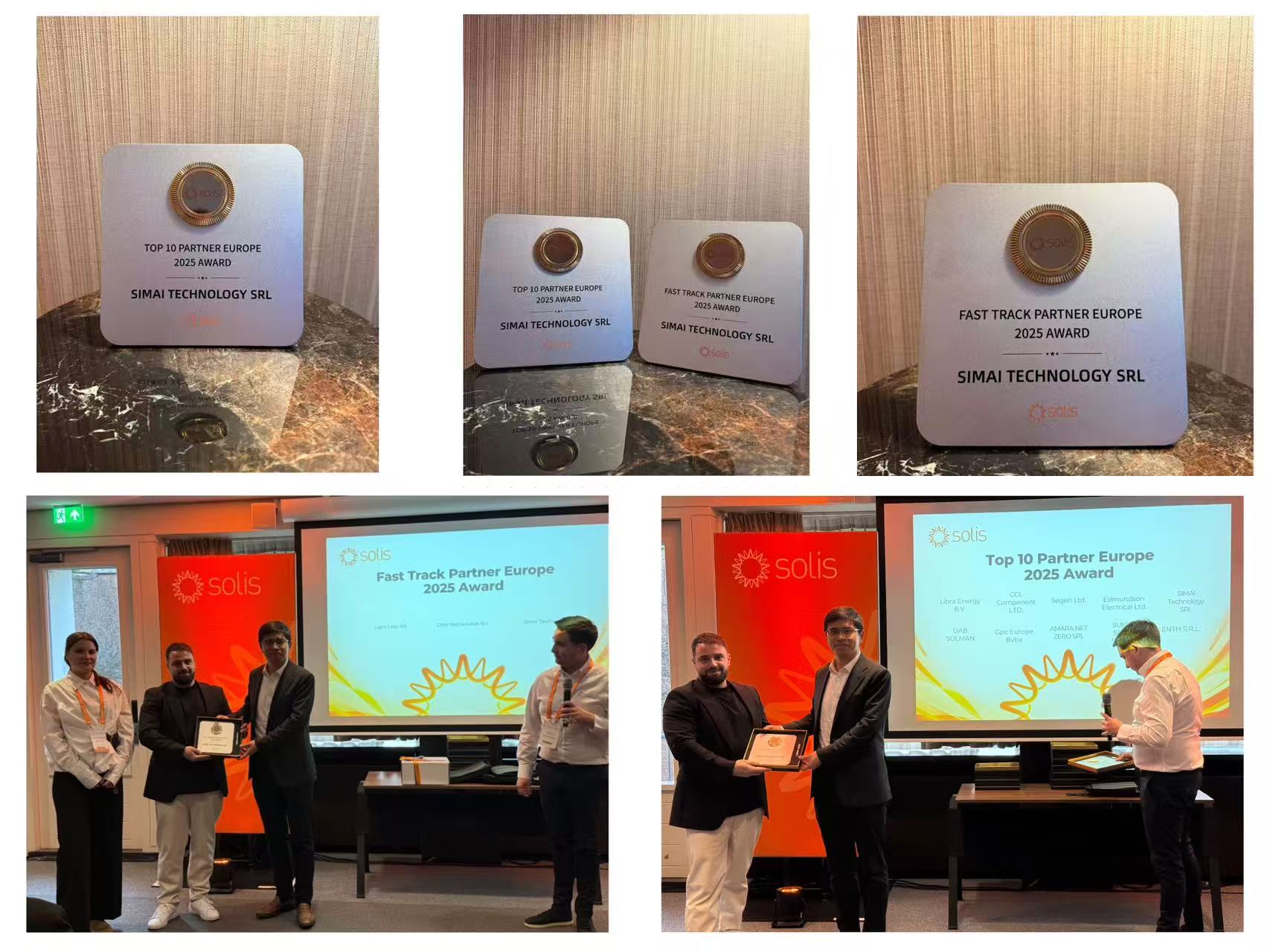 Receiving these awards from Solis, a global leader in photovoltaic string inverters, is a significant milestone for Simai Technology.The TOP 10 Partner Europe Award recognizes Simai's impressive sales volume and its established position within the top tier of Solis's European network. Meanwhile, the Fast Track Partner Award highlights the company's exceptional agility and rapid market expansion over the past year.