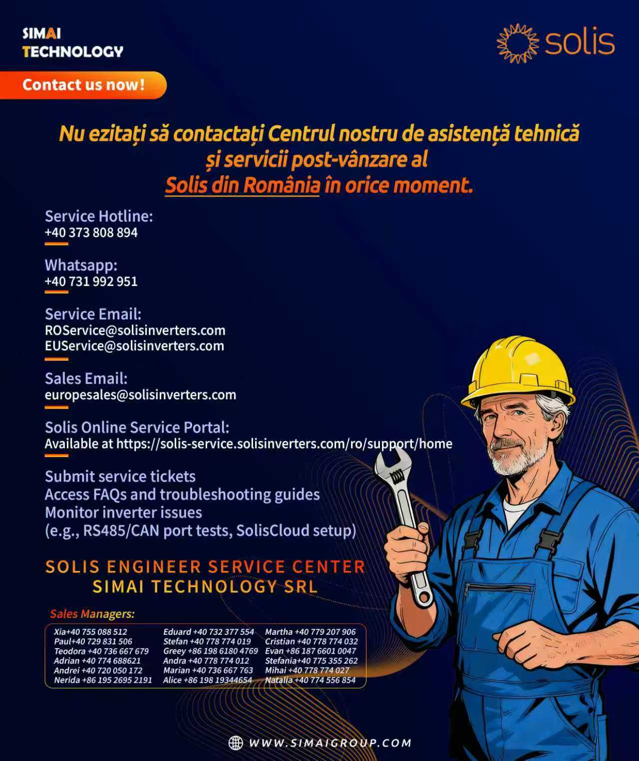Simai Technology and Solis are dedicated to providing top-tier technical assistance and after-sales service. Save this contact card to reach our Romania team instantly via our Hotline, WhatsApp, or Online Service Portal for troubleshooting, sales inquiries, and support tickets.